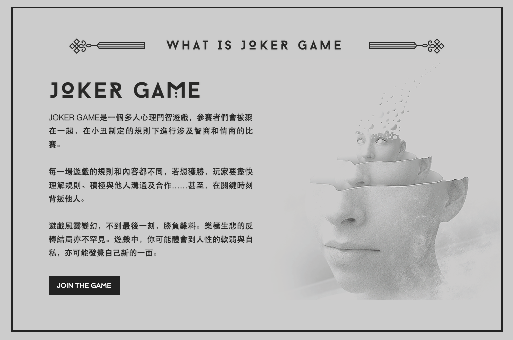 网站已经改版,介绍了【JOKER GAME】,也说明了如何报名参加游戏,可点击上面链接了解更多。不过因为服务器不在国内,可能从国内访问会比较慢。