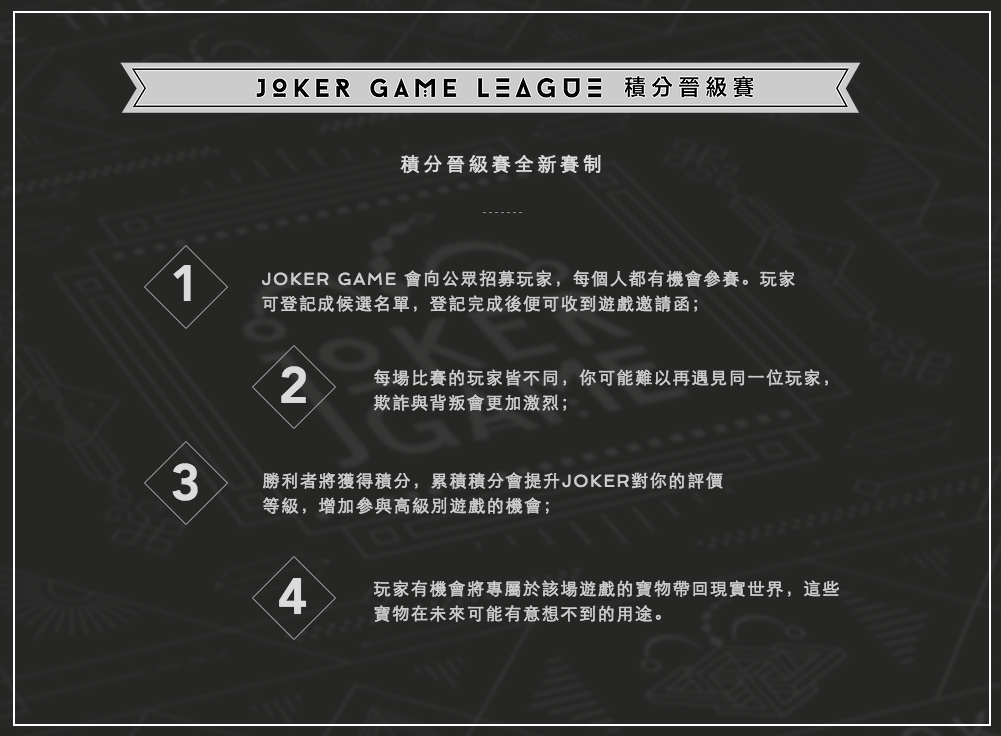 【JOKER GAME】积分晋级公开赛已经在准备中,预计于今年六月份进行第一场比赛。