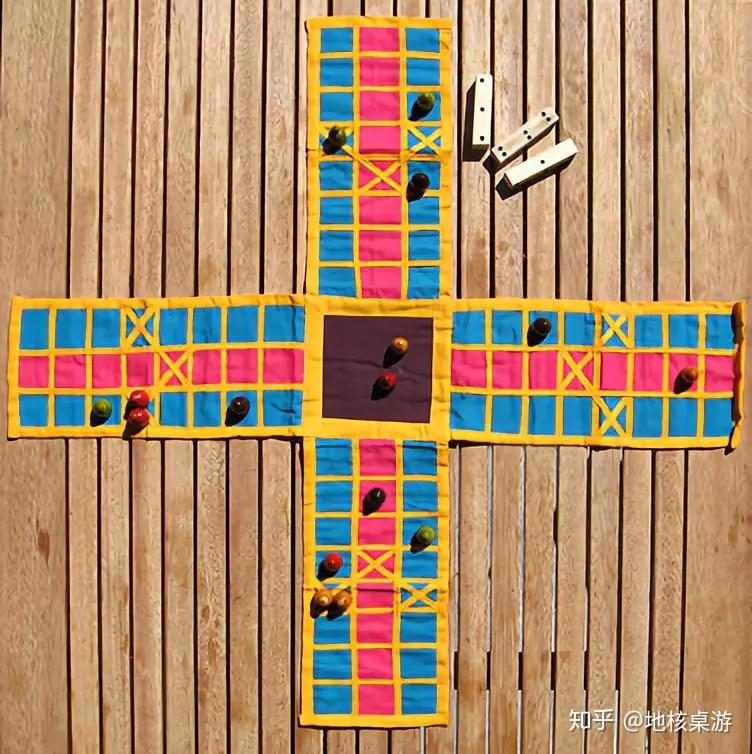 起源于印度,棋盘为一个对称的十字形布片,最多可以四人游戏,玩家每人拥有四枚棋子,最先将四枚棋子走到终点则获胜。游戏中用六颗两面骰进行游戏,需要投出0、1、6点可以将一枚棋子放入场上并且再投一次,若投出0点可以走25格,投出1点走10格。