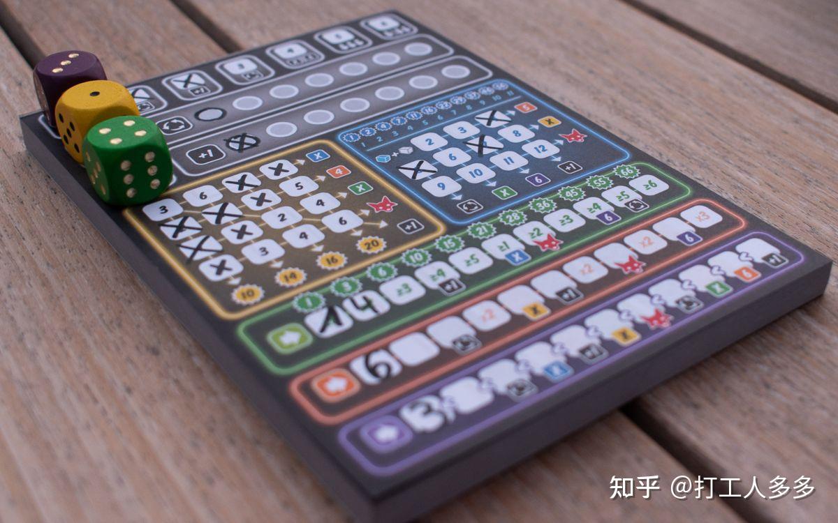 简单到极致的骰子纸笔游戏,可单人solo也可多人比拼刷分。游戏进行多轮,每轮中玩家一次掷出6颗不同颜色的骰子,挑选其中三颗骰子的点数,填入对应颜色栏(一些是划掉对应点数)。当某一栏被填满或填入的格子内有技能时,可获得分数或相应技能(重roll、复制骰面、指定填数等),简单点说就是「投骰子 – 安排骰面位置 – 触发combo」。